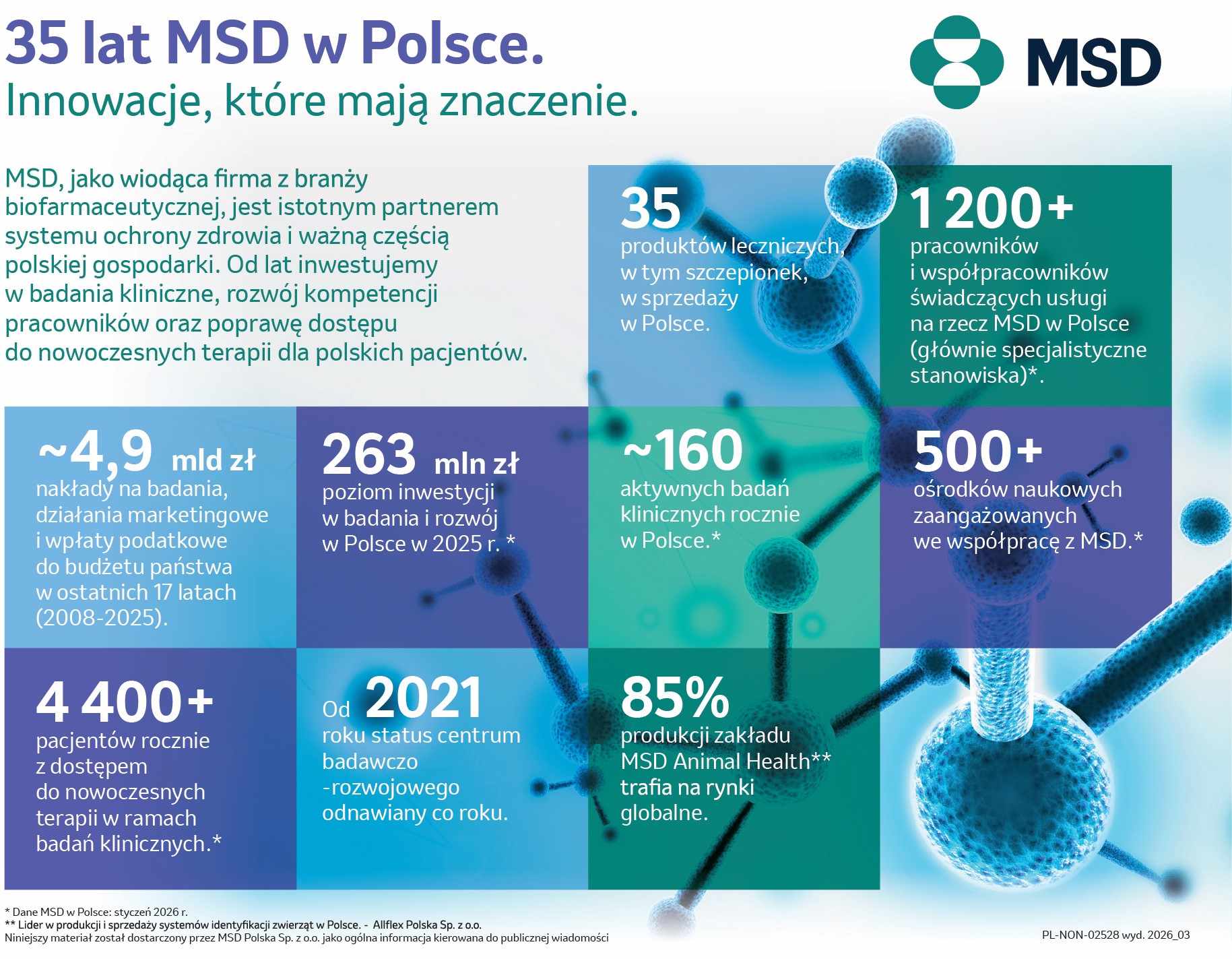 W ciągu swojej ponadwiekowej historii, MSD wnosło istotny wkład w postęp medycyny i nadal przyczyniamy się do jej rozwoju. Jesteśmy liderem innowacji w dziedzinie onkologii, w rozwoju nowych szczepionek immunoonkologicznych i jedną z nielicznych firm farmaceutycznych na świecie, która prowadzi badania nad nowymi antybiotykami, skierowanymi przeciwko bakteriom antybiotykoopornym. Badania są dla nas jądrem postępu medycznego. Generują pomysły i rozwiązania, które pozwalają pacjentom żyć lepiej i dłużej. Dlatego co roku MSD inwestuje w badania i rozwój ponad jedną czwartą globalnego obrotu.