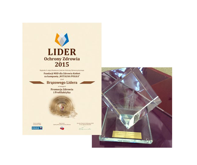 Tytuł Brązowej Liderki Ochrony Zdrowia w kategorii Promocja Zdrowia i Profilaktyka dla Fundacji MSD dla Zdrowia Kobiet